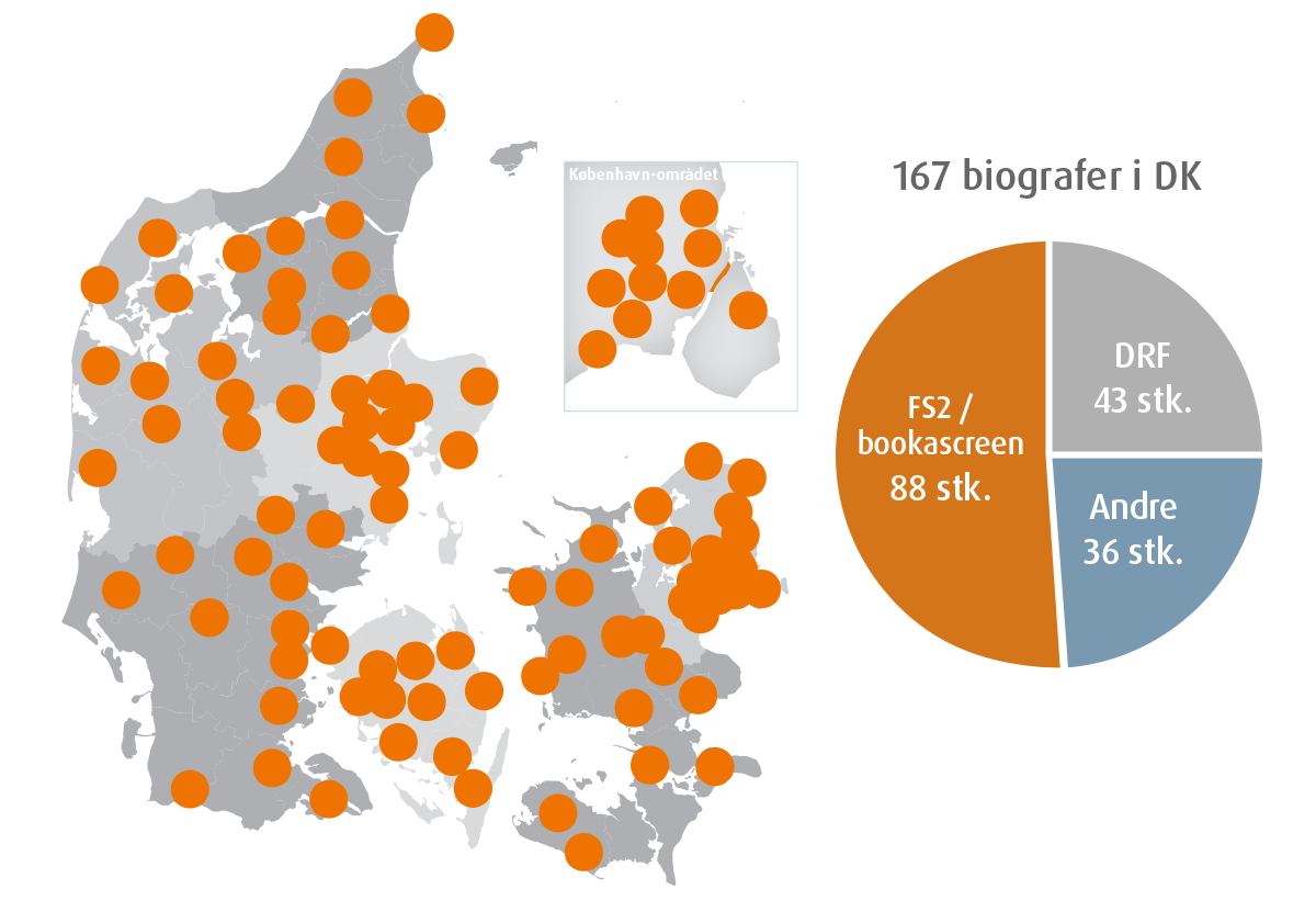 Vi stiller det store lærred til rådighed i 88 danske biografer med i alt 187 sale. Vores netværk dækker alt fra de små lokalbiografer til nogle af landets største provins- og metropolbiografer. Vi er repræsenteret i 25 af de 30 største byer i Danmark.